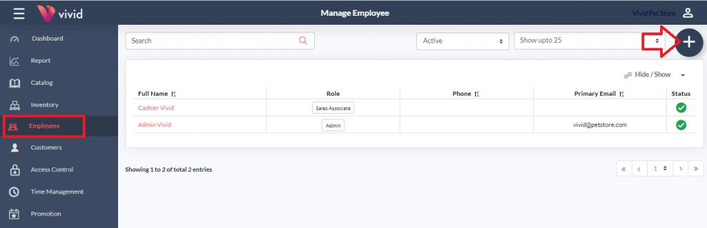 To add a new employee, go to the left navigation, tap on Employee and click sign on the top right corner.