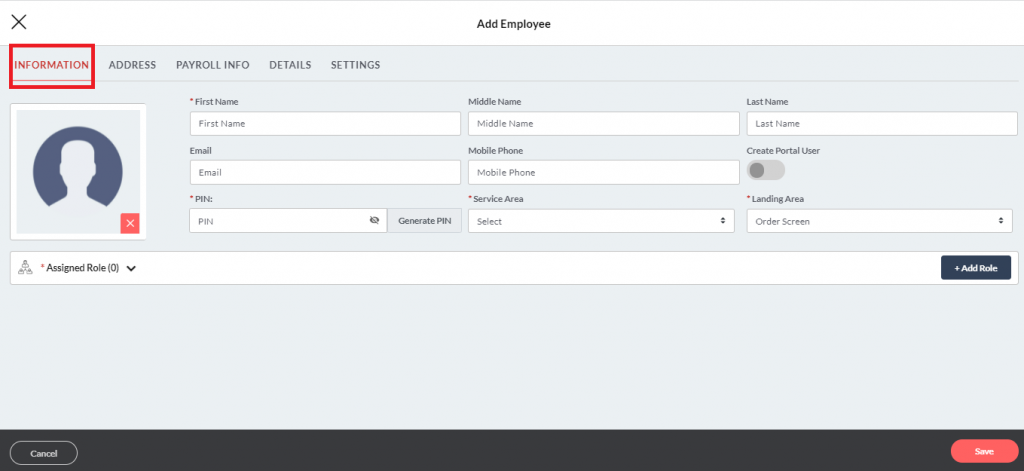 Click Generate PIN to create a new login pin for this employee. Select the Service area and Landing area, s/he is working in. Under the Assigned Role field, select the Default Role for an employee if this employee has multiple roles and click .