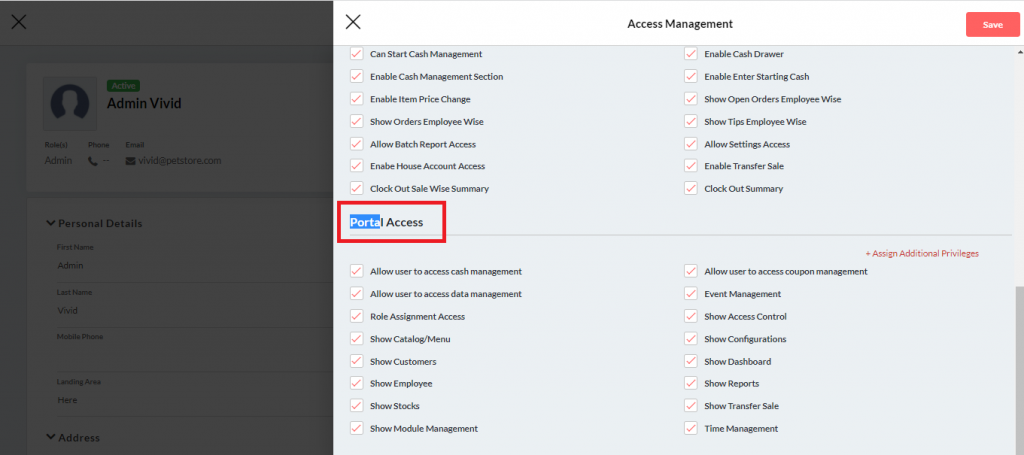 On the Access Management screen, scroll down to locate the Portal Access section and select/deselect the permissions based on the employee’s role in an organization.